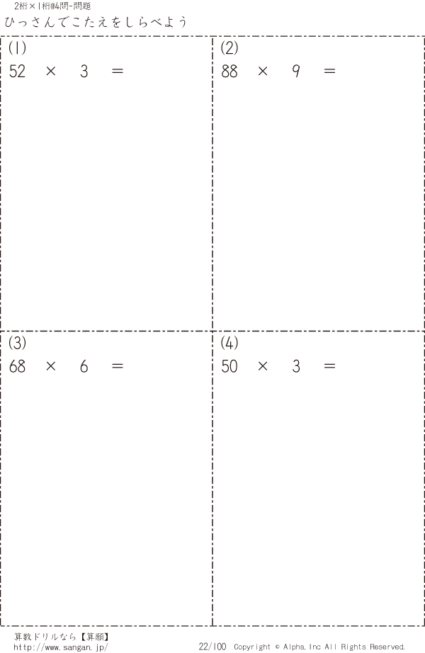 計算ドリル 小学1年~3年生の計算練習プリントを印刷できます。 一問一答のWeb版もあります。 マス計算 たしざん・ひきざん・かけざんのマス計算用紙を印刷できます。 Web版はプリント不要掛け算の筆算 算数プリントメニュー 「@24」は1ページに24問、という意味です。 2桁×1桁の筆算 1桁×2桁の筆算 2桁×2桁の筆算 3桁×1桁の筆算 3桁×1桁の筆算 (中央がゼロ) 3桁×2桁の筆算 3